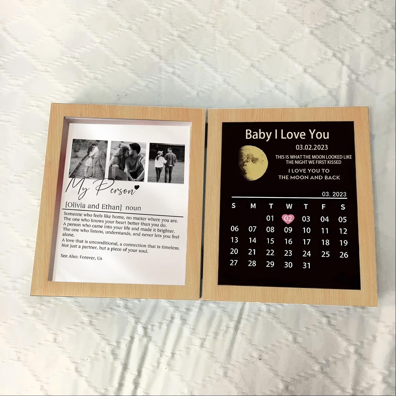 This is more than just a photo frame; it is a miniature museum of your love story. The left side defines your romance, while the right side captures the exact moon phase from your most special night, turning those life-changing moments into a timeless and tangible keepsake.