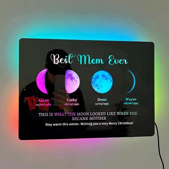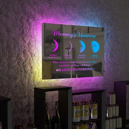 A Truly Unique & Emotional Gift Say “I love you to the moon and back” in a celestial, heartfelt way. Just like the moon’s phases, a mother’s love is constant and radiant. Capture the exact moon phase from any special date and display it on a beautifully personalized mirror — a stunning keepsake she’ll cherish forever.