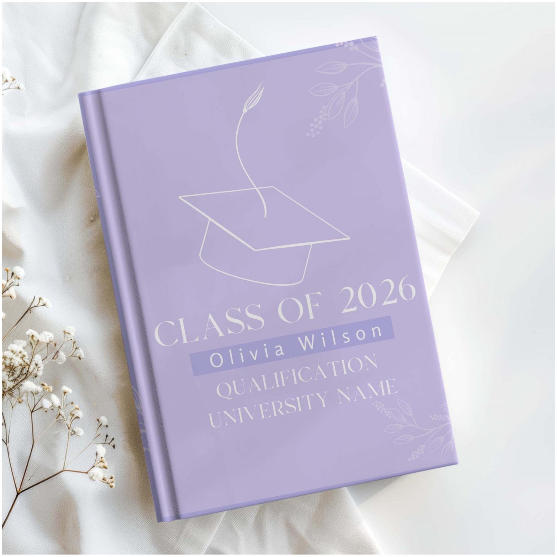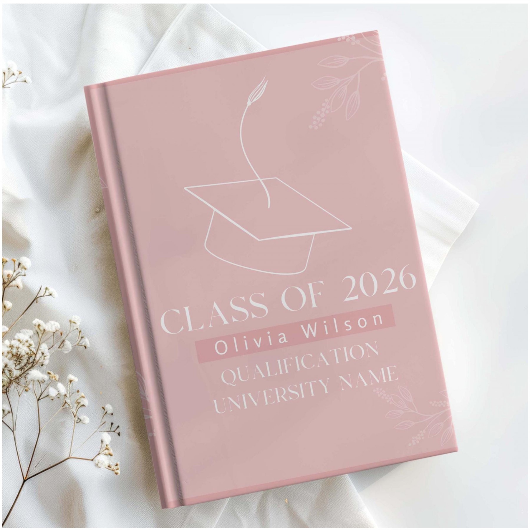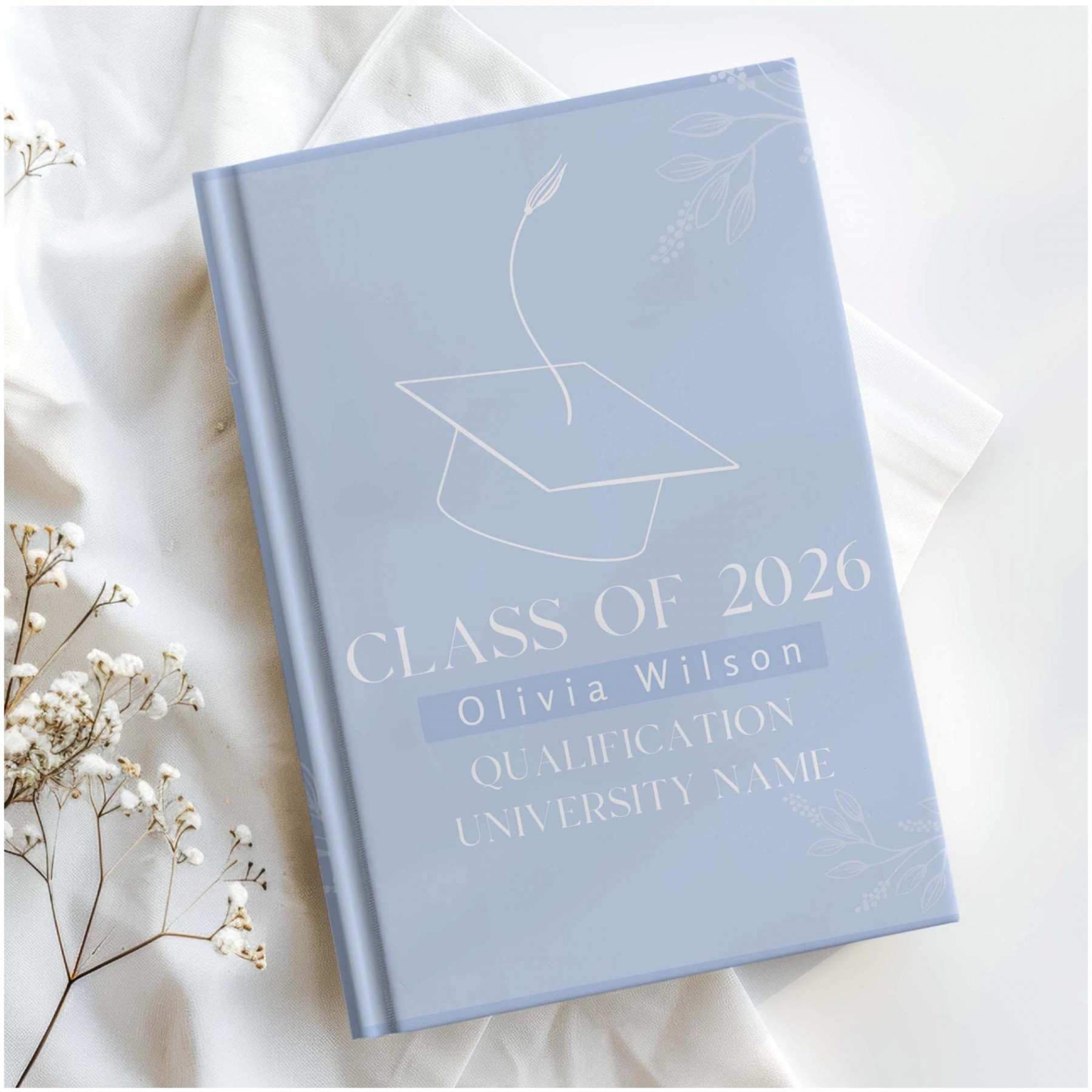 Personalized college graduation journal — a timeless keepsake to honor a university graduate’s next chapter. This custom hardcover notebook features the graduate’s name, choice of flower, color, and optional custom back message, making it a meaningful and lasting graduation gift.