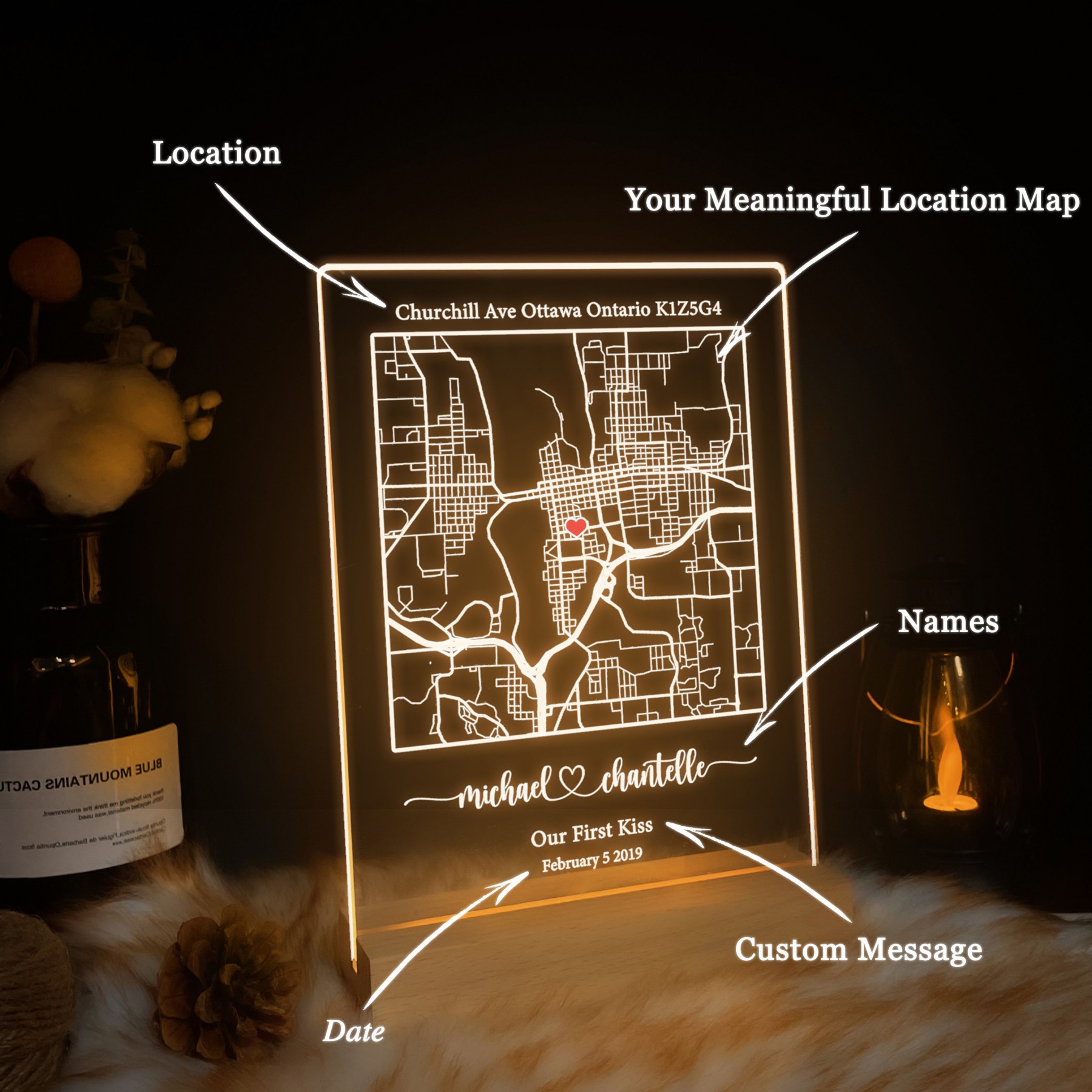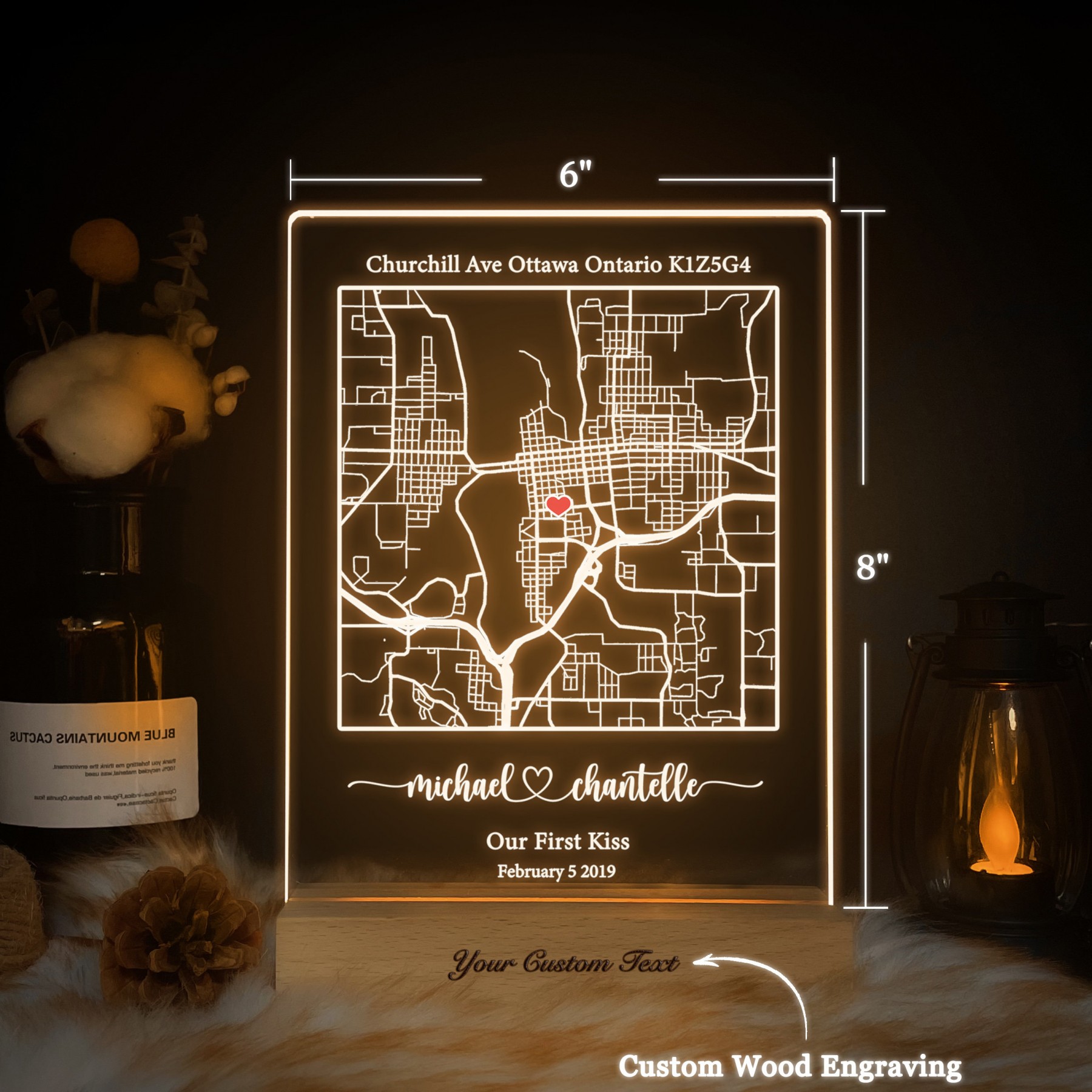 Custom Our First Kiss Acrylic Map Night Light for Couple