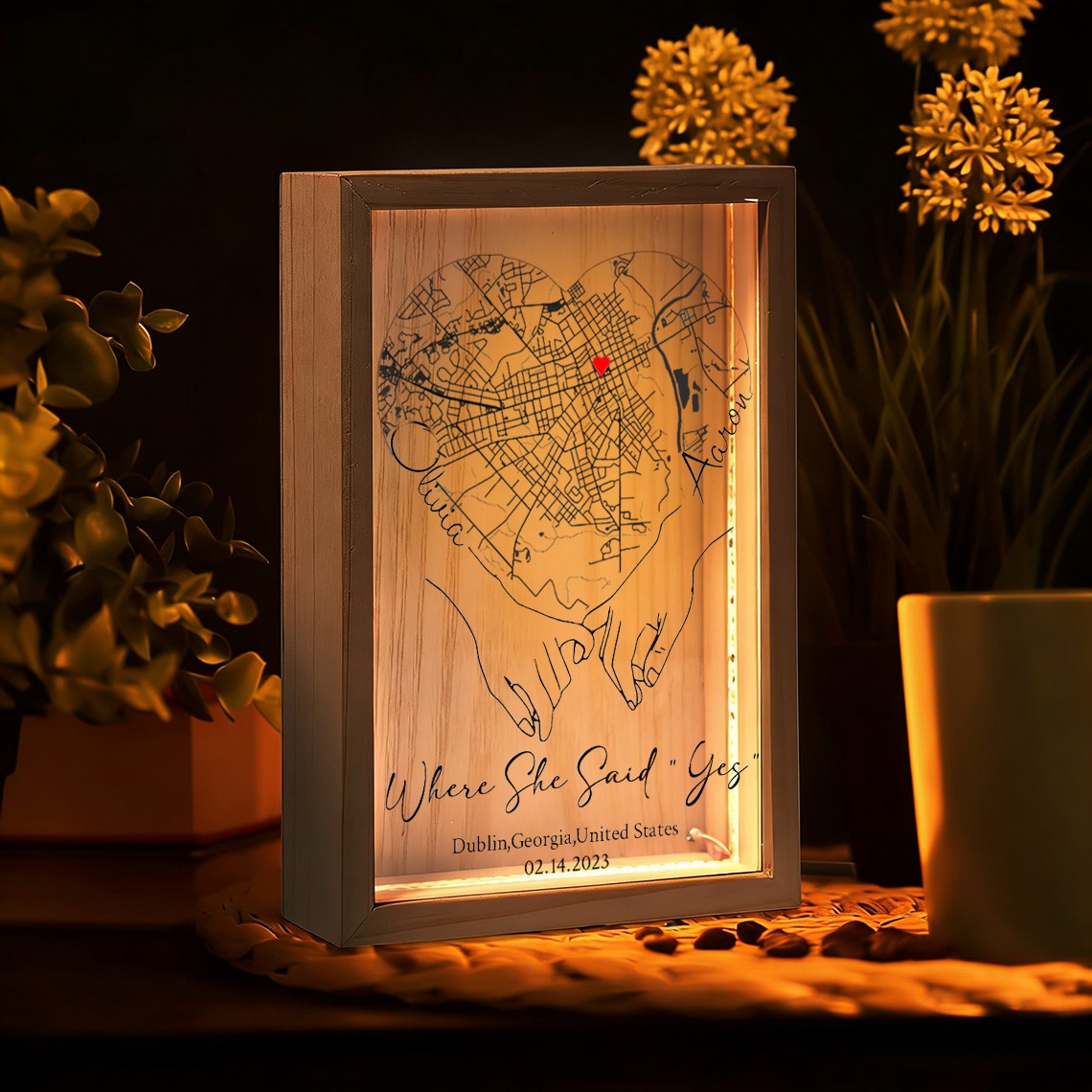Personalized Where She Said Yes Map Light Box for Couple turns a meaningful location into a warm and eye catching display. Featuring a custom map design that highlights the place your story began, this light box transforms a special memory into a timeless piece of home décor. Made with a clear acrylic panel and a natural wood base, it adds a modern and elegant touch to bedrooms, desks, and living spaces. The print appears on one side with a soft mirrored reflection on the back, creating a clean and layered visual effect.