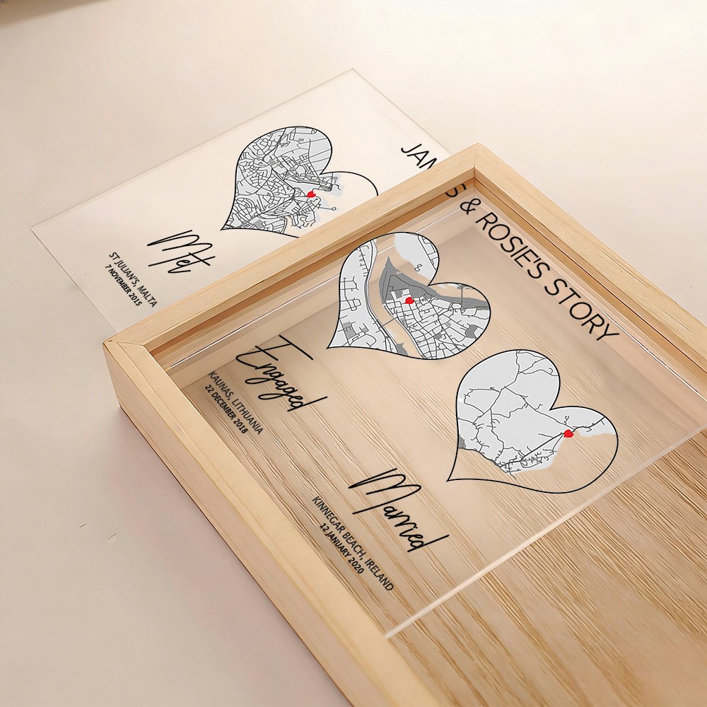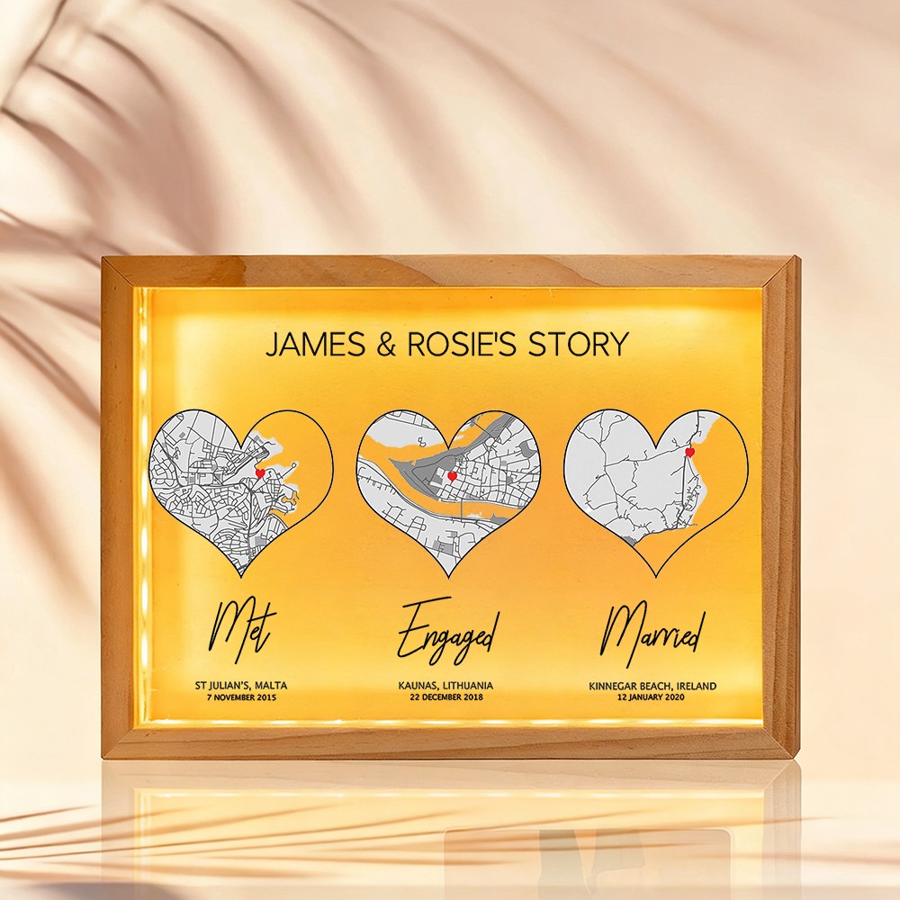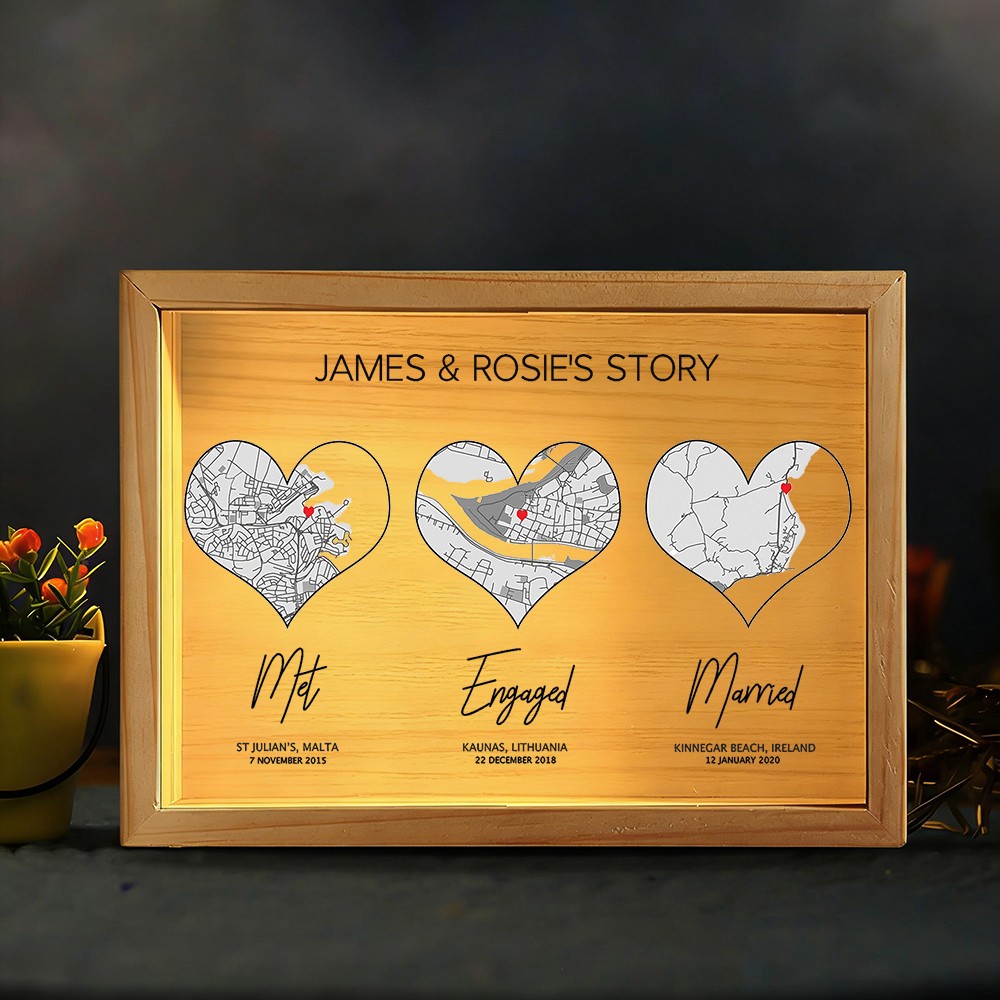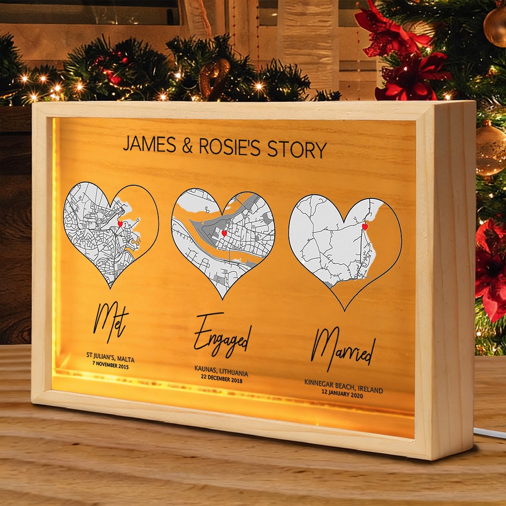 The Personalized Love Story Map Wooden Light Box for Couple transforms your most important moments into a warm and meaningful display. Designed to showcase one to three custom map locations, it visually tells the story of your journey together — from where you first met to the milestones that followed.